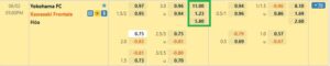 Vì là một kèo loại mà ở đó bạn sẽ chỉ cần dự đoán chính xác kết quả trận đấu. Vì vậy, theo tôi bạn cá nhân ở các trận đấu mà sức mạnh 2 đội có sự chênh lệch lớn và bạn sẽ chọn đội bóng trên. Với các lựa chọn như vậy, bạn sẽ dễ dàng nhận được tỉ lệ thắng lên đến 65%. The example on the table of kèo, Kawasaki Frontale is the team on.