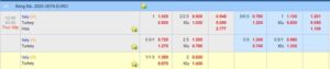 Trên hình là ví dụ về tỷ lệ cược Hồng Kông, trận đấu giữa Italy (Italia) và Turkey (Thổ Nhĩ Kỳ) thuộc khuôn khổ vòng chung kết Euro 2020-2021. Giả sử anh em lựa chọn đặt cược kèo châu Á (handicap).